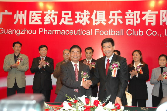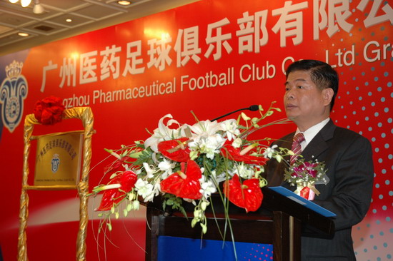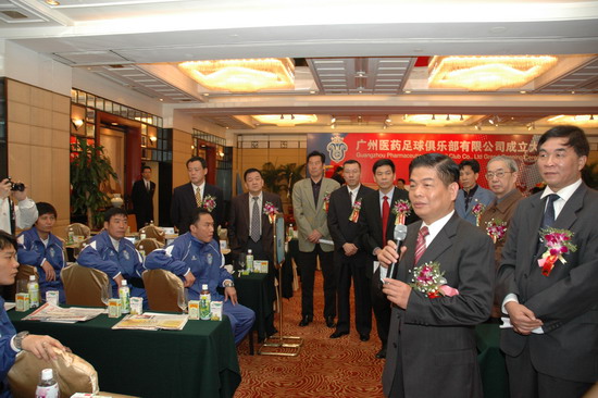 楊榮明董事長(zhǎng)認(rèn)為,廣藥與廣州足球的“聯(lián)姻”可以說(shuō)是醫(yī)藥文化與足球文化的有機(jī)結(jié)合。足球運(yùn)動(dòng)本身與醫(yī)藥的追求始終都是為了健康,強(qiáng)強(qiáng)融合,勢(shì)不可擋。廣藥從經(jīng)營(yíng)角度而言,是實(shí)施品牌戰(zhàn)略需要。廣藥集團(tuán)作為廣州國(guó)企中龍頭企業(yè),經(jīng)濟(jì)實(shí)力雄厚,屬下20多家企業(yè)達(dá)數(shù)百個(gè)產(chǎn)品。去年廣藥集團(tuán)確定了立足廣東,“西進(jìn)、北上、東擴(kuò)”的新戰(zhàn)略。參與足球就是借足球這一全球影響力最大的項(xiàng)目,把廣藥推向全國(guó)以及國(guó)際。“我們注資足球是回饋社會(huì)的一種方式。廣藥這次“涉足”,不是贊助,而是投資——俱樂(lè)部注冊(cè)資金達(dá)2000萬(wàn)元。我們?cè)谥Υ蛟熘袊?guó)制藥業(yè)的艦?zāi)傅耐瑫r(shí),也將全力打造足球這塊城市的名片”楊榮明解開了廣藥集團(tuán)參與足球之迷,顯然是動(dòng)真格的。當(dāng)天,廣藥足球隊(duì)全體將士身穿藍(lán)色(廣藥CI設(shè)計(jì)主色調(diào))隊(duì)服,讓人們眼前一亮,尤其隊(duì)徽,別有新意。“隊(duì)徽?qǐng)D案整體取廣州市木棉花的形狀;花托為一對(duì)羊角,隱喻羊城,花中心為廣藥LOGO,花蕊是皇冠,寓意廣州隊(duì)問(wèn)鼎中國(guó)職業(yè)足球啊。在此,首先祝你們沖超成功”。楊榮明董事長(zhǎng)對(duì)在座的廣州足球運(yùn)動(dòng)將士興致勃勃地解說(shuō)新隊(duì)徽,并給他們打氣。